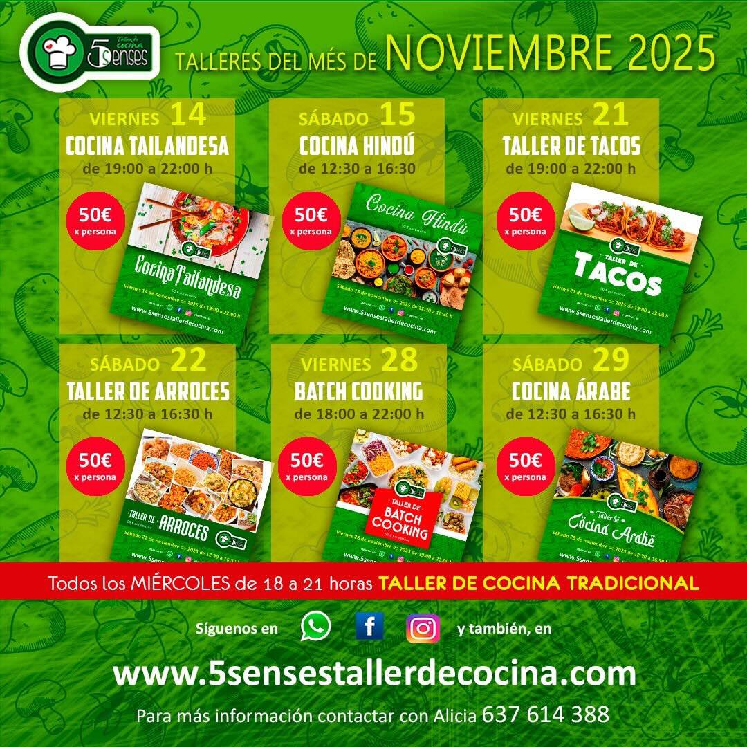 En 5Senses Taller de Cocina no solo se cocina… se viaja con el paladar, se aprende con las manos, y se comparte con el corazón. Y este noviembre de 2025 lo hemos preparado para ti con una propuesta irresistible: 6 talleres temáticos + el clásico Taller de Cocina Tradicional cada miércoles.