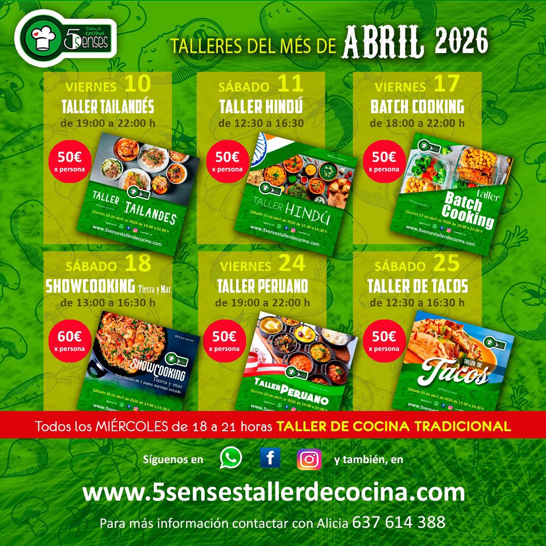 Las plazas son limitadas. Si alguno de estos talleres te llama la atención, no lo dejes para después. Consulta toda la información en www.5sensestallerdecocina.com o contacta con Alicia en el 637 614 388.