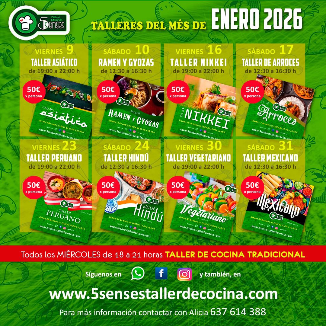 Enero arranca fuerte en 5 Senses Taller de Cocina con una programación pensada para quienes disfrutan aprendiendo, cocinando y comiendo bien. Durante todo el mes, nuestra cocina se convierte en un recorrido por sabores del mundo, técnicas auténticas y recetas que podrás replicar en casa.